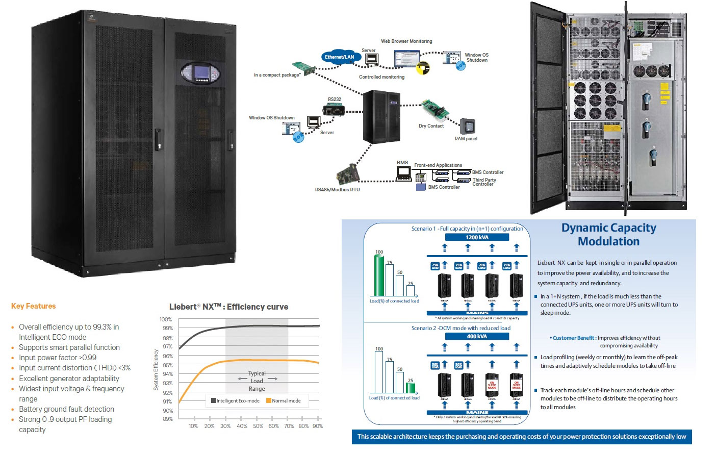 Introducing the Liebert® NX 250-1000kVA, a next generation three phase UPS solution from Vertiv The Liebert® NX delivers the best combination of availability, reliability and energy-eff¬iciency. It presents an industry-leading features such as intelligent energy management that promotes eff-icient energy measures in the infrastructure and outstanding power protection technology that is designed to use optimum energy, generate less CO2 and occupy optimum footprint in order to provide significant cost savings. The Liebert® NX is equipped with transformer free design with full IGBT double conversion technology that enables extraordinary savings on installation and operating expense athe same time delivering high quality protection to your critical load.