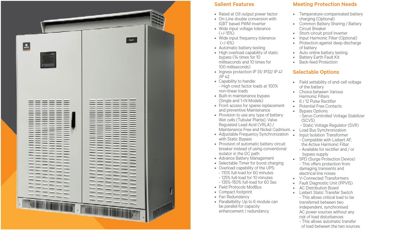 The Liebert® Hipulse-U off¬ers a reliable, scalable and user-friendly solution to ensure availability of various critical applications. The Liebert® Hipulse-U off¬ers protection to your investment, and provide lower cost of ownership through its digital architecture and range of options which you can customize specifically for your needs.