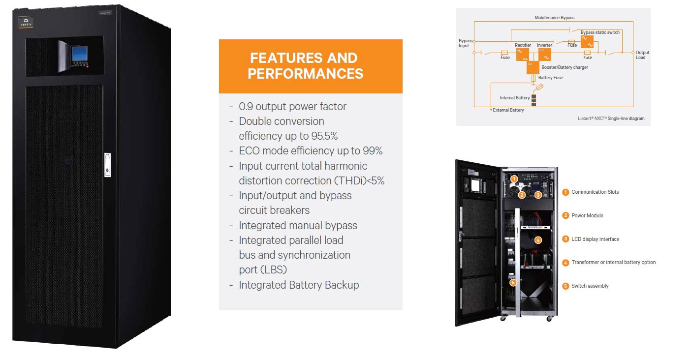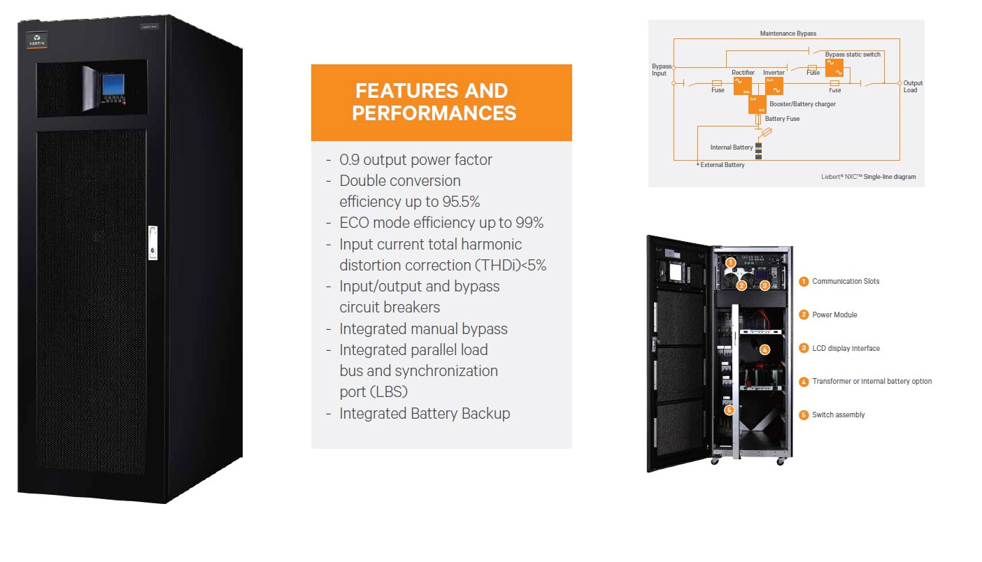 Liebert® NXC’s combination of performance features, impressive integrated autonomy and compact footprint make it ideal for guaranteeing clean, continuous power for a wide range of applications from IT and manufacturing to retail and transport. Liebert® NXC achieves up to 95.5% efficiency in double conversion mode and up to 99% in ECO mode ensuring effective load protection while reducing the total cost of ownership (TCO) and environmental impact.