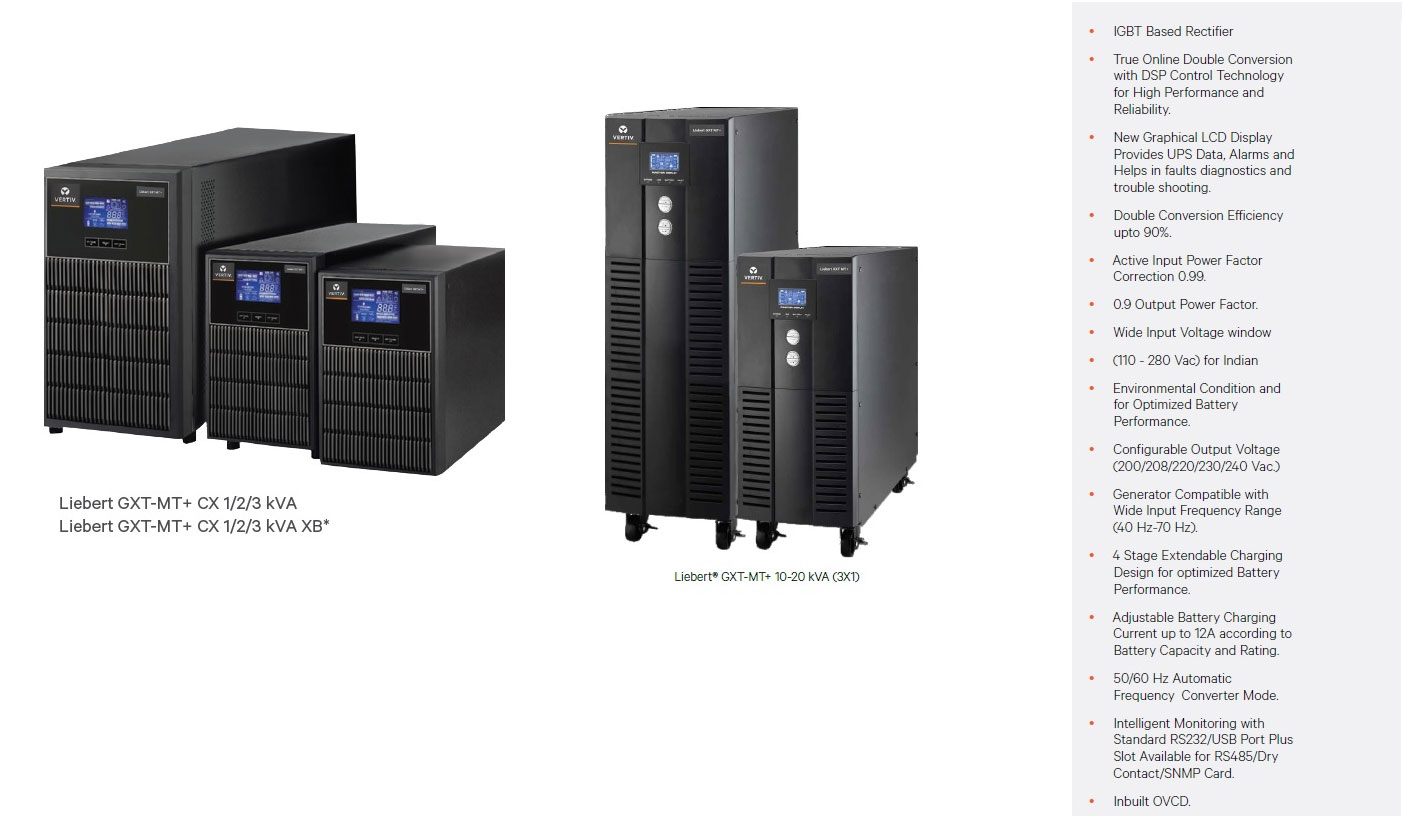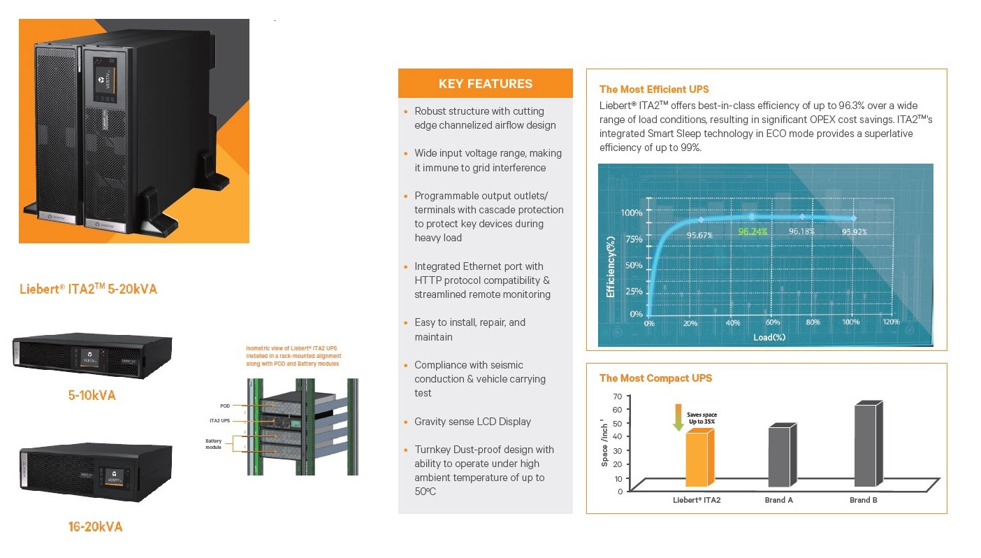 The Liebert® ITA2 is a fully-digital, highly reliable, True Online double conversion UPS solution that delivers clean and consistent power. This highly eff¬icient solution is ideal for various deployments, whether it's IT racks, network closets, automation control systems, and precision instruments to small-sized control rooms.